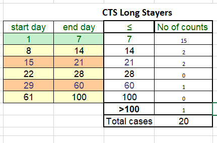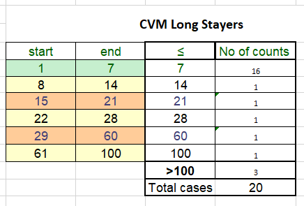 我目前正在使用Countifs()来计算在一定范围内的长期逗留人数(停留时间)。我现正计算1至7宗、8至14宗、15至21宗(无点票)等个案的数目,详情见下图。但是,我需要countifs()只分别计算CVM和CTS下的案件。所有CVM和CTS病例都放在一张单张上,