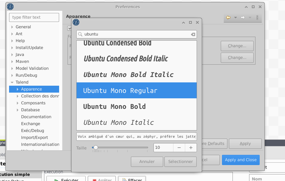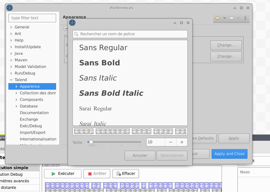 然后,在左侧,转到Talend > Appearance,并更改用于“备注文本字体”和“控制台文本字体”的字体。
