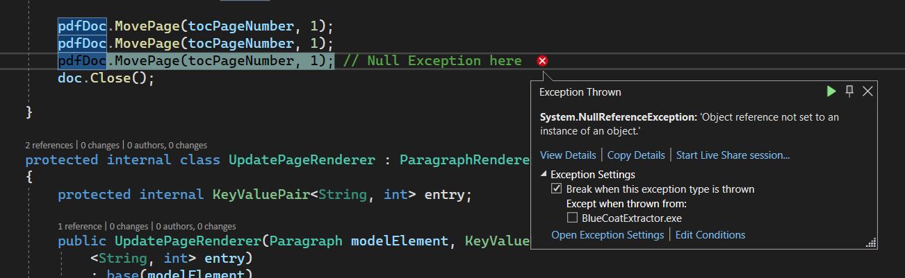 pdf.MovePage(tocPageNumber, 1); // null exception