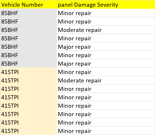 calculate(distinctcount(vehicle number), filter(table1, table1[panel damage severity]="Moderate repair"))