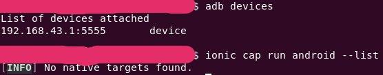 我已经设法连接到设备通过亚行,无论是TCP和USB模式。但Ionic似乎没能探测到这个装置。NPM版本为8.3.1,电容版本为3.3.4。安装了“电容器/核心”和“电容器/cli”。我曾在其他Ionic的社区网站上寻找解决方案,但他们都没有帮助。
