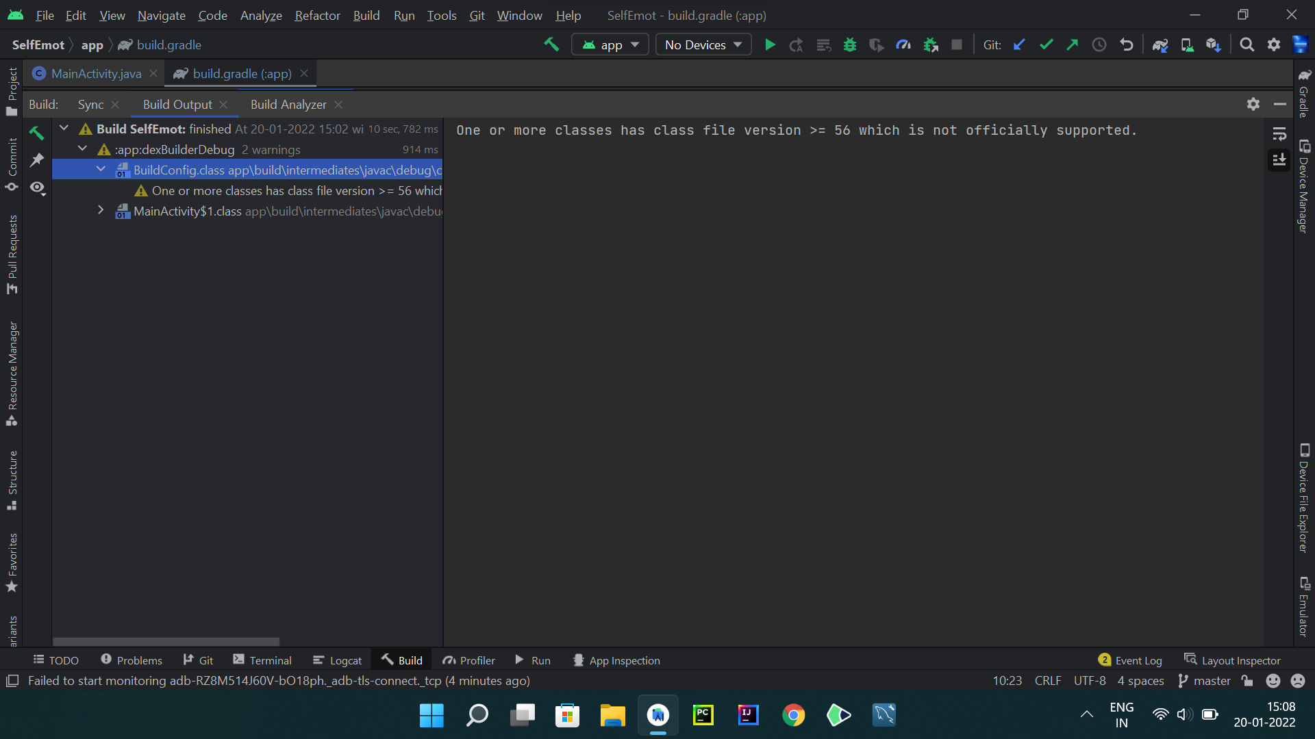 (警告文本-> “一个或多个类的文件版本>= 56不受官方支持”)