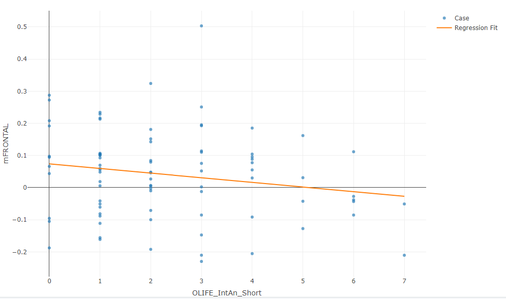 fig = fig %>% add_trace(data = xy, x = ~ OLIFE_IntAn_Short, y = ~mFRONTAL, name = 'Regression Fit', mode = 'lines', alpha = 1)