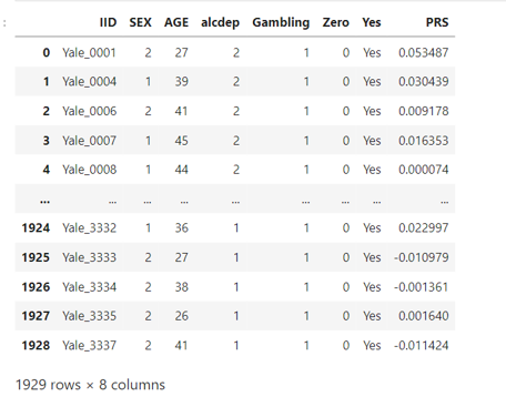 {'IID': {0: 'Yale_0001', 1: 'Yale_0004', 2: 'Yale_0006', 3: 'Yale_0007', 4: 'Yale_0008'}, 'SEX': {0: 2, 1: 1, 2: 2, 3: 1, 4: 1}, 'AGE': {0: 27, 1: 39, 2: 41, 3: 45, 4: 44}, 'alcdep': {0: 2, 1: 2, 2: 2, 3: 2, 4: 2}, 'Gambling': {0: 1, 1: 1, 2: 1, 3: 1, 4: 1}, 'Zero': {0: 0, 1: 0, 2: 0, 3: 0, 4: 0}, 'Yes': {0: 'Yes', 1: 'Yes', 2: 'Yes', 3: 'Yes', 4: 'Yes'}, 'PRS': {0: 0.053486584299999994, 1: 0.0304387435, 2: 0.00917773968, 3: 0.016352741100000002, 4: 7.433452840000001e-05}}