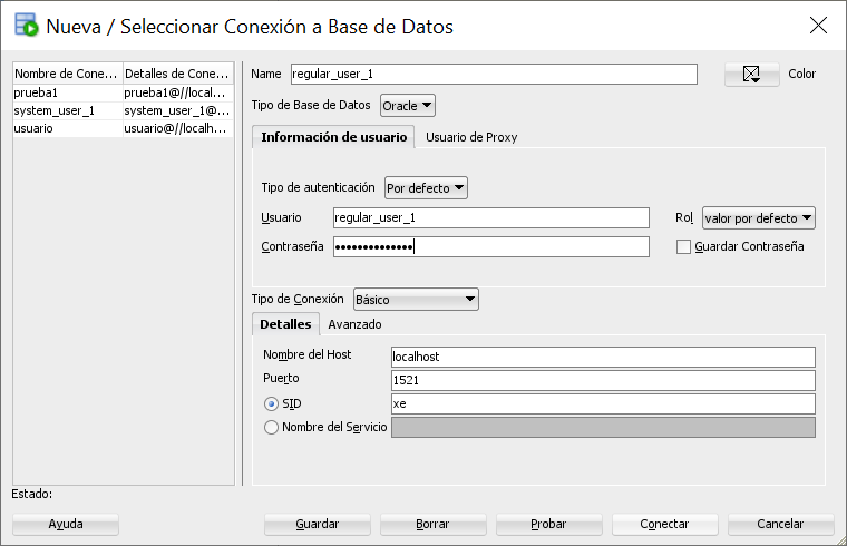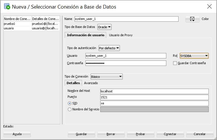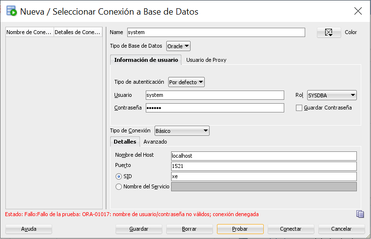 user: system as sysdba但是,在SQL连接对话框中,tipo de conexion设置为Basico。打开下拉菜单,选择Sysdba,您应该会没事的。
