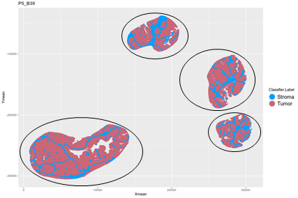 我有关于x和y位置的二维数据,最多可以容纳上百万个细胞。我想把这些单元格自动注释到不同的位置。在下面的例子中,我希望找到4个与4个椭圆对应的簇。到目前为止,我尝试了kmeans和GMM,但未能正确地将细胞注入到预期的集群中。HDBSCAN能够在单元格的子集上这样做,但受到整个数据集上RAM的限制。还有其他的R工具适合这个用例吗?谢谢