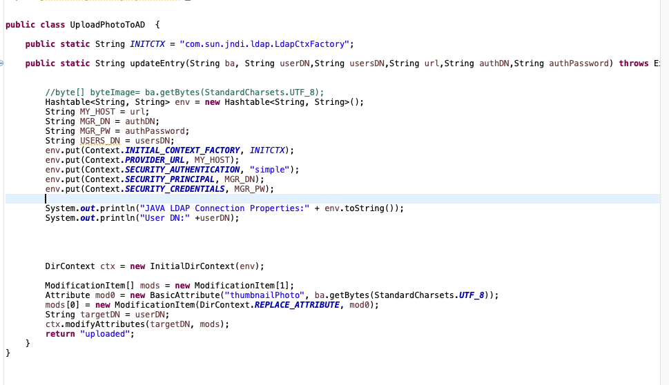 UploadPhotoToAD::updateEntry(ldap.image as Binary, ldap.userDN, ldap.usersDN, ldap.url, ldap.authDN, ldap.authPassword)如果你不知道这里遗漏了什么或者其他什么,都需要改变。