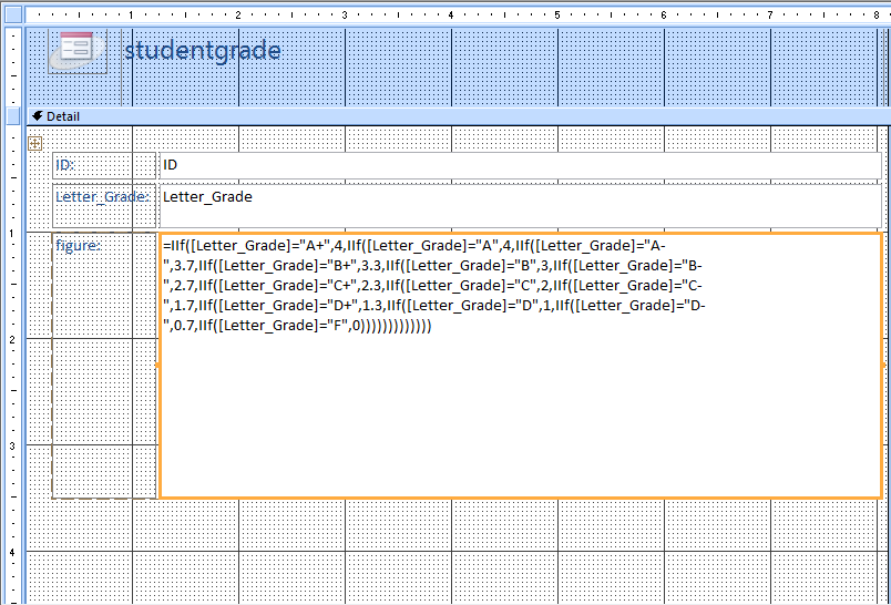 IIf(Letter_Grade="A+",4,IIf(Letter_Grade="A",4,IIf(Letter_Grade="A",3.7 ),IIf(Letter_Grade="B+",3.3,IIf(Letter_Grade="B",3 ),IIf(Letter_Grade="B",2.7,IIf(Letter_Grade="C+",2.3 ),Letter_Grade=(C),2,(en20#“C”,1.7,(,1.3,(“D”),1,IIf(Letter_Grade="D-",0.7,IIf(Letter_Grade=“F”,0)