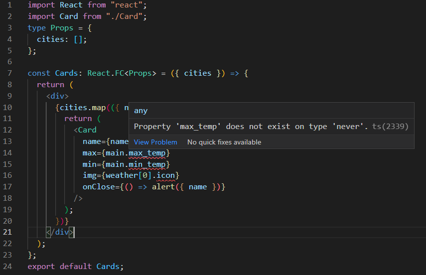 属性'max_temp‘在’从不‘类型上不存在。属性'min_temp‘在’从不‘类型上不存在。