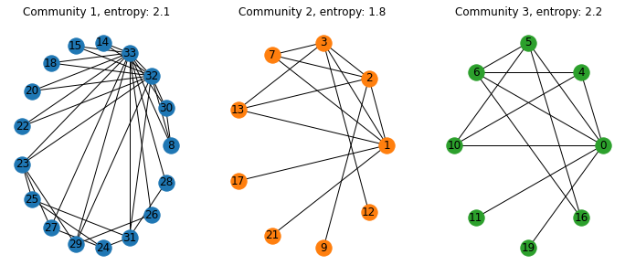 使用我提供的代码来回答您的问题,这里可以从社区创建图表。您可以首先为每个社区创建不同的图表(基于图形的社区边缘属性)。然后,您可以使用shannon_entropy和degree_distribution函数计算每个社区的熵。