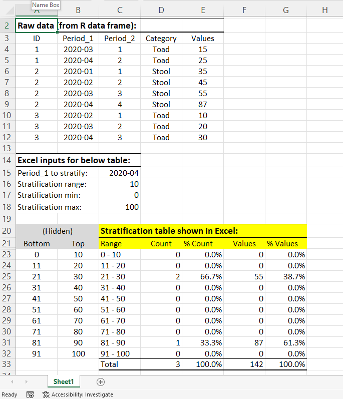 我对R很陌生,总是在Excel中进行分层。在底部的图像中,您可以看到我通常如何在Excel中分层,最终产品以黄色突出显示。我还包括第二张图像,它显示了用于生成第一幅图像中的分层表的公式。