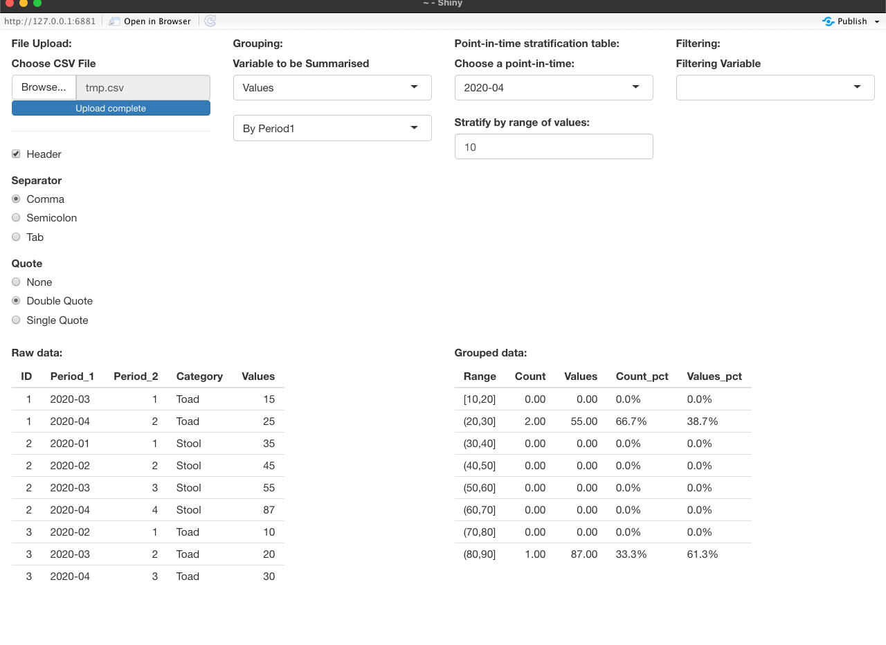 为了使这成为一个更普遍的努力,我将如何做到这一点。在UI中,您可以上传一个CSV文件,它从文件中的名称中获取要使用的变量的名称。这里有一个警告-分组变量必须在它们的名字中有“句号”。否则,您可以从变量名称列表中选择要求和的值。时间点值取自分层变量的观测值。您还可以选择对单变量进行筛选,并且可以从筛选变量的观察值中提取可以筛选的值。看上去是这样的: