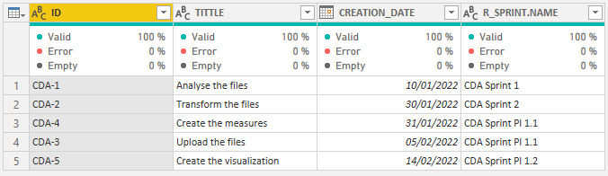 #"Expanded R_SPRINT" = Table.ExpandTableColumn(#"Merged Queries", "R_SPRINT", {"NAME"}, {"R_SPRINT.NAME"})结果: