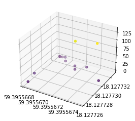 我试图从CSV文件中绘制大量的纬度、经度、海拔和EMF值。CSV文件如下所示