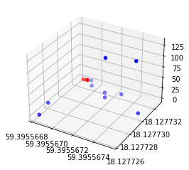 ax.scatter(latitude, longitude, EMF, c='r', marker='o')