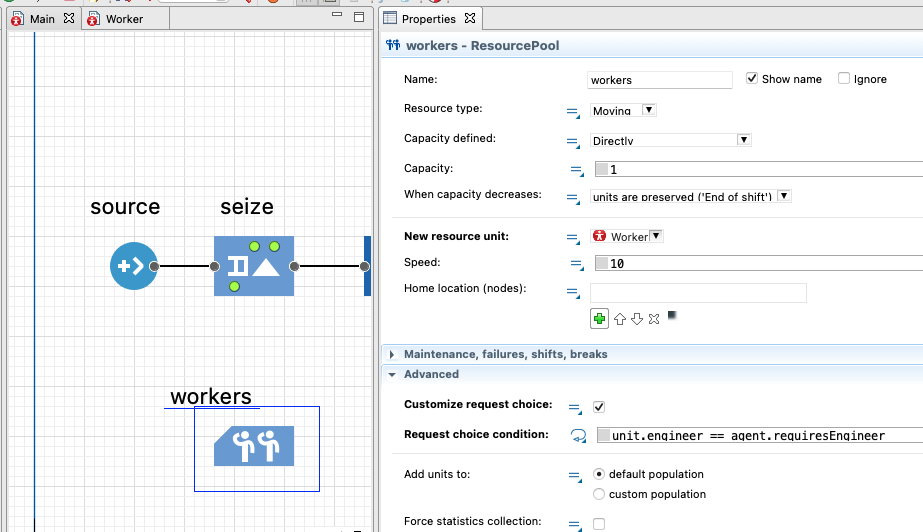 我需要创建一个工人的ResourcePool。然而,每个工人可以有不同的资格(属性)。例如,名为“工人”的ResourcePool应该包括不同类型的工人(例如焊工、工程师等)。然后,我有一个抓住块的一些生产过程。我想要捕捉块从ResourcePool‘工人’的工人,然而,条件是这些工人符合这一特定的生产过程的要求。例如,我有一个需要工程师的生产过程。我想从ResourcePool的‘工人’中挑选一个工程师,但是ResourcePool也应该包括其他工人,而不仅仅是工程师。问题是,一个工人可以同时做一个工程师和一个焊工。如果我分别为工程师和焊工创建资源库,那么这个既是工程师又是焊工的工人将被表示为两个独立的工人。在我的案子里这不是通缉犯。如何在AnyLogic中实现这一点?