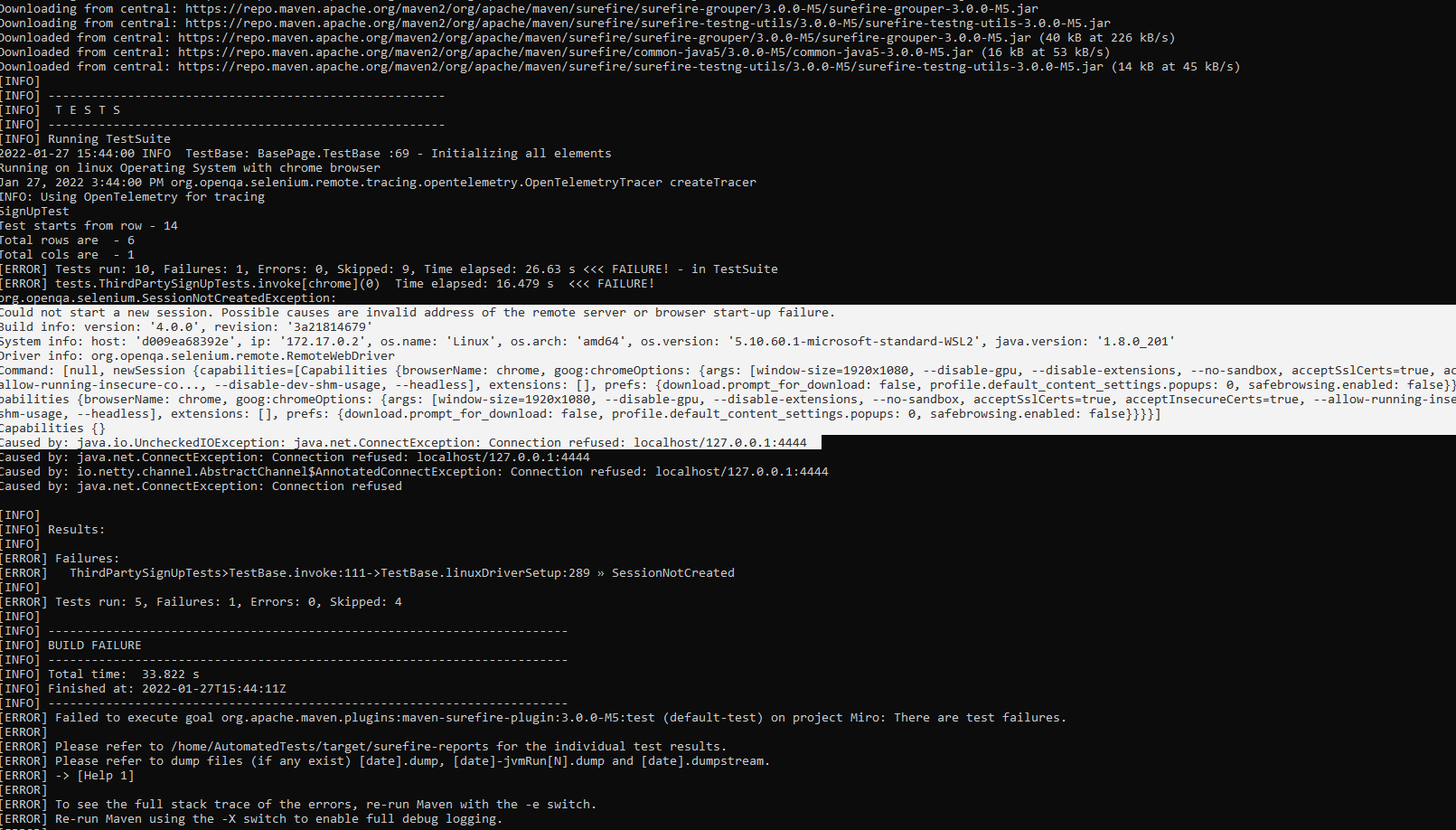 我已经创建了测试自动化框架的坞映像。我正在使用docker-组合文件来运行chrome、firefox和edge的selenium (集线器和节点)。