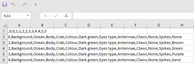 4 Background Ocean Body Crab Colour Dark green Eyes type Antennae Claws None Spikes Sand 可以看到,相同名称的列在导入时被Pandas (或Python)修改,因此将其添加到下一列,其名称与前一列相同。