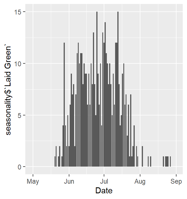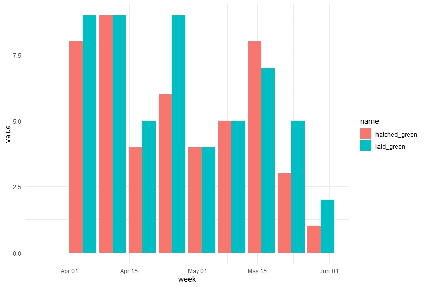 我试图在一张图上绘制海龟筑巢和孵化的季节性图--统计每一季(01/05/2021-30/09/2021)每一天产卵/孵化的数量。我的一些数据如下:
