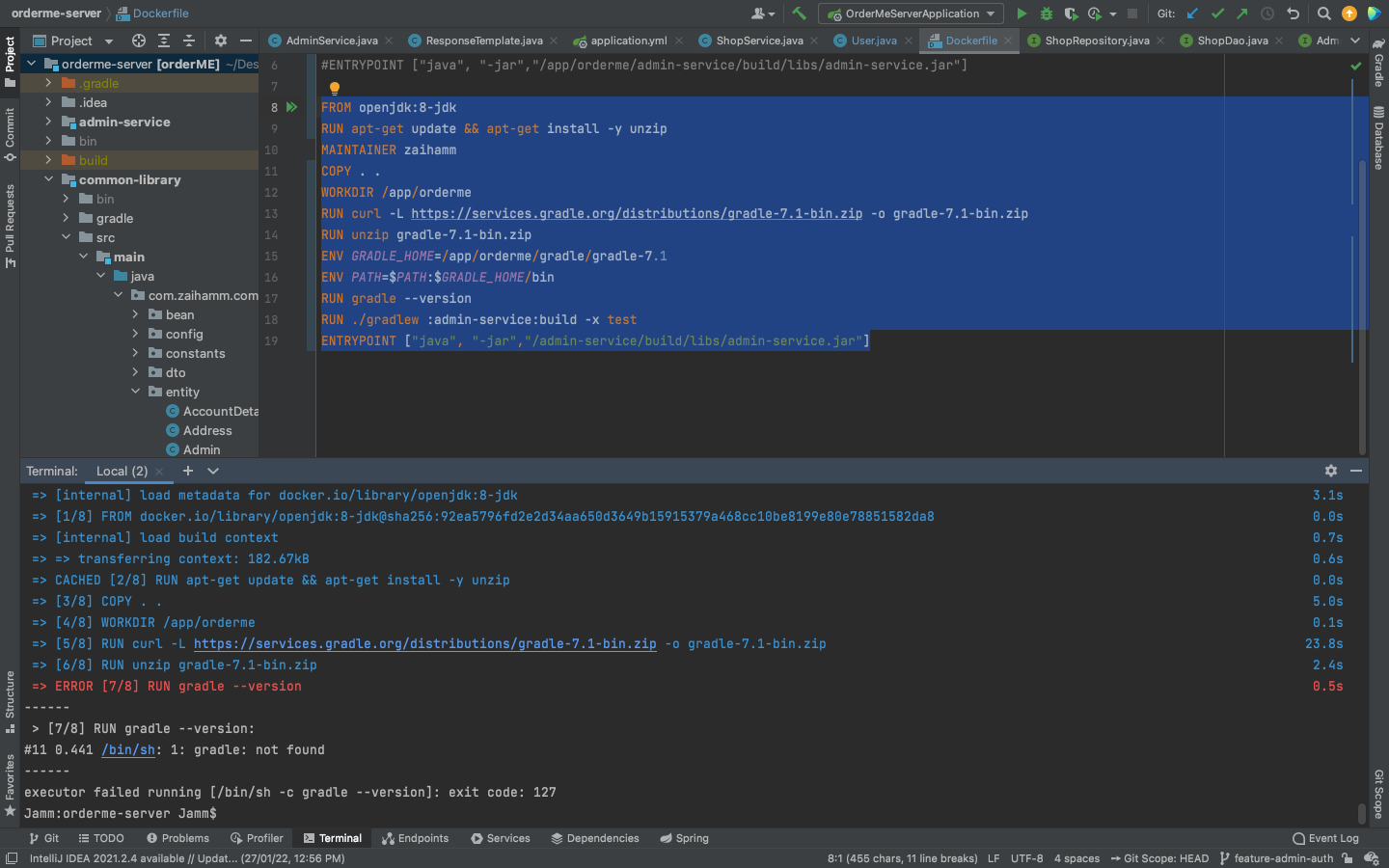 ENTRYPOINT ["java", "-jar","/admin-service/build/libs/admin-service.jar"]当我运行码头构建-t命令。/它给出错误。