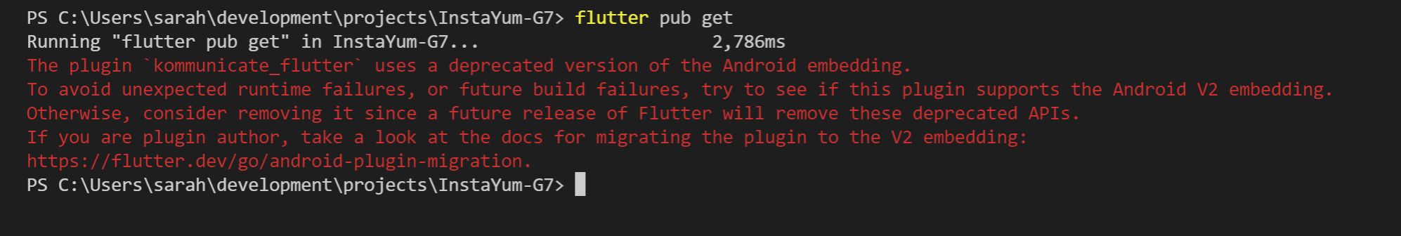 插件kommunicate_flutter使用的是安卓嵌入的不受欢迎的版本。为了避免意外的运行时失败,或者将来的构建失败,请尝试查看这个插件是否支持Android V2嵌入。否则,考虑删除它,因为以后的Flutter版本将删除这些不受欢迎的API。如果您是插件作者,请查看将插件迁移到V2嵌入:https://flutter.dev/go/android-plugin-migration的文档。