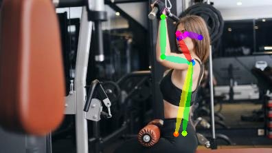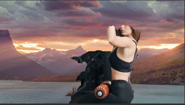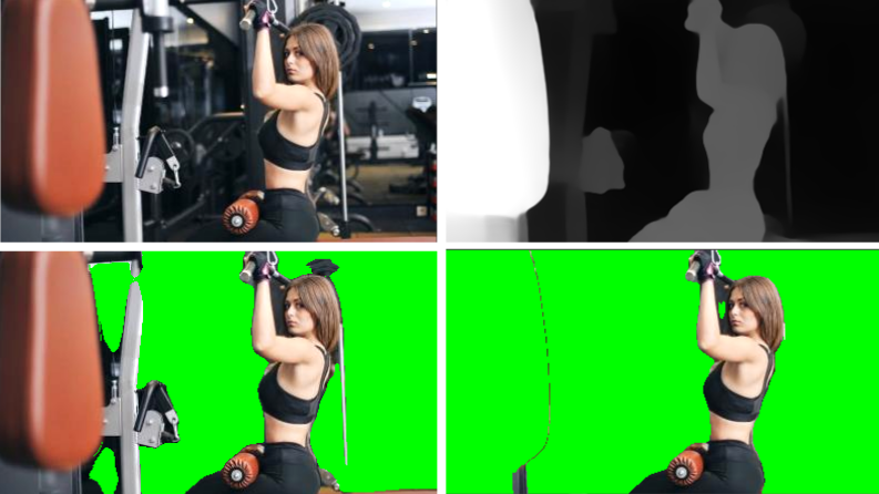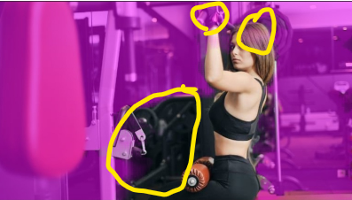 带有重叠的分割图像:观察女性的头发是如何标记为粉红色的,健身器材和她腿附近的周围都被标记为非粉红色。甚至她的手都被标记为粉红色(意为背景)。