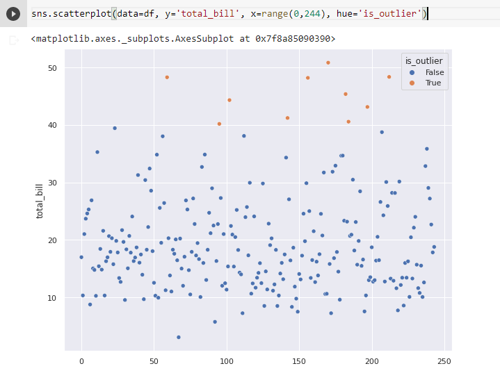 sns.scatterplot(data=df['total_bill'], hue=is_outlier)发布于 2022-01-30 22:14:06