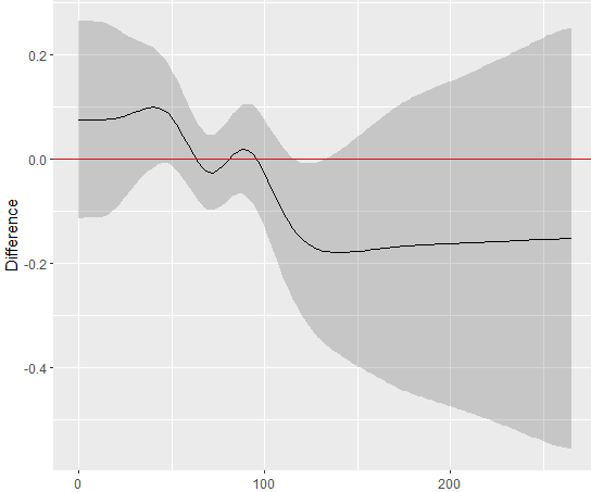 draw(diff1)这给出了gam()调用中"by“变量的每个级别的两个平滑值之间的差异图。该图有一个95%的可信区间(CI)的差异。统计显着性,或0.05水平的统计显着性区域,是通过y=0线是否或在哪里跨越CI来评估的,其中y轴代表平滑之间的差异。