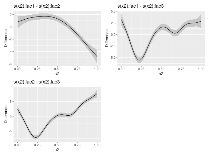 在这种方法中,by变量被转换为有序的范畴变量,这使得mgcv::gam与参考级别相比产生了差异平滑。然后用gam模型的summary命令以通常的方式检验差异平滑的统计意义。