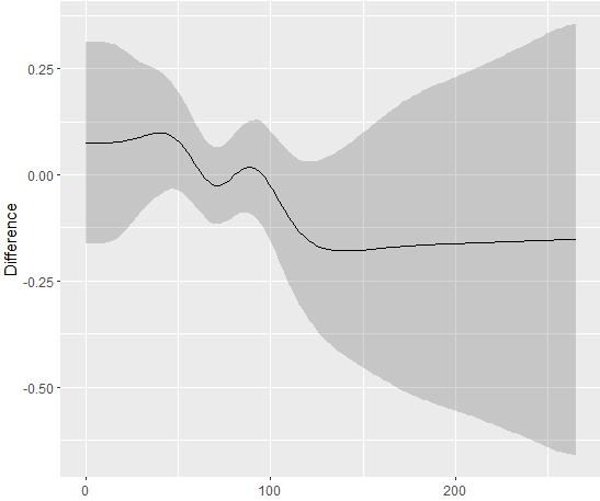 我正在使用Gavin的有用的惠给包来提取因子变量的两个不同级别的两种平滑的差异。平滑是由精彩的mgcv软件包生成的。例如