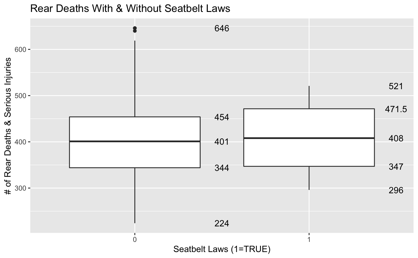 ggplot(sb,aes(x=law,y=rear))+geom_boxplot()+labs(x="Seatbelt Laws (1=TRUE)",