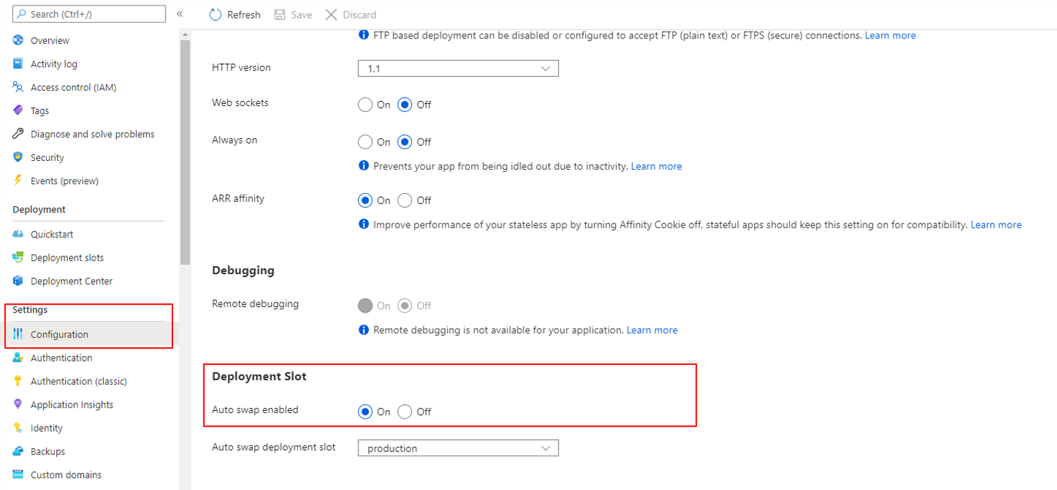 “自动交换”可以通过转到'App Service' > 'Deployment Center' >'Slot' > 'Configuration'.打开或关闭。