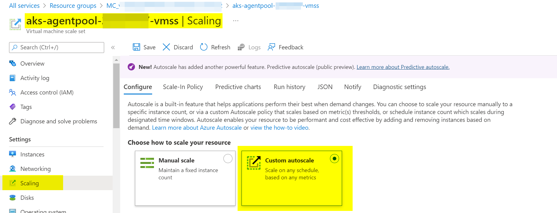 转到您的VMSS -->在“设置”下,选择“缩放->将您的缩放类型设置为自定义的自动缩放”