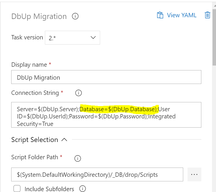 我们使用DbUp迁移任务(https://marketplace.visualstudio.com/items?itemName=johanclasson.UpdateDatabaseWithDbUp)将SQL脚本部署到Azure DevOps中的Microsoft服务器上,当我需要部署到单个数据库时,它的工作非常好,但请有人帮助我如何将此任务用于同一服务器中的多个数据库,或用于多个数据库的任何其他方法。