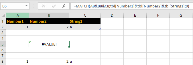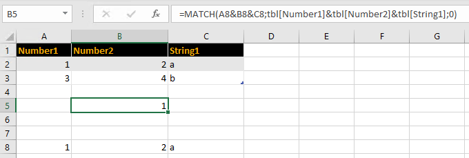 =MATCH(A8&B8&C8,IF({1},tbl[Number1]&tbl[Number2]&tbl[String1]),0)