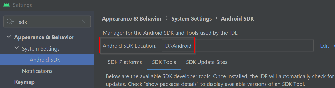您可以在设置、->外观和行为->系统设置下的Android中找到通往平台-tools/亚行的途径-> Android。