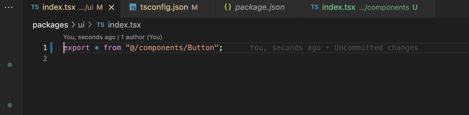 我看到的问题是ts模块混叠没有正确配置。我目前有一个ui包,我试图像这样从index.tsx导出一个按钮组件(注意,VS代码不抱怨,它认为它可以解决模块):