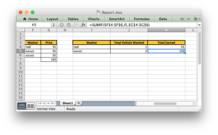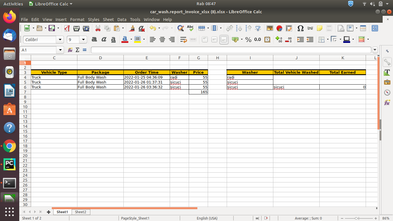 我想从excel文件中得到的是洗衣机不应该重复,清洗的总车辆应该是计算一个雇员在左边桌子上清洗的次数(例如: sicuci = 2,radi = 1),而总挣的是价格*整车清洗,在这种情况下,sicuci将是110,radi将是55。
