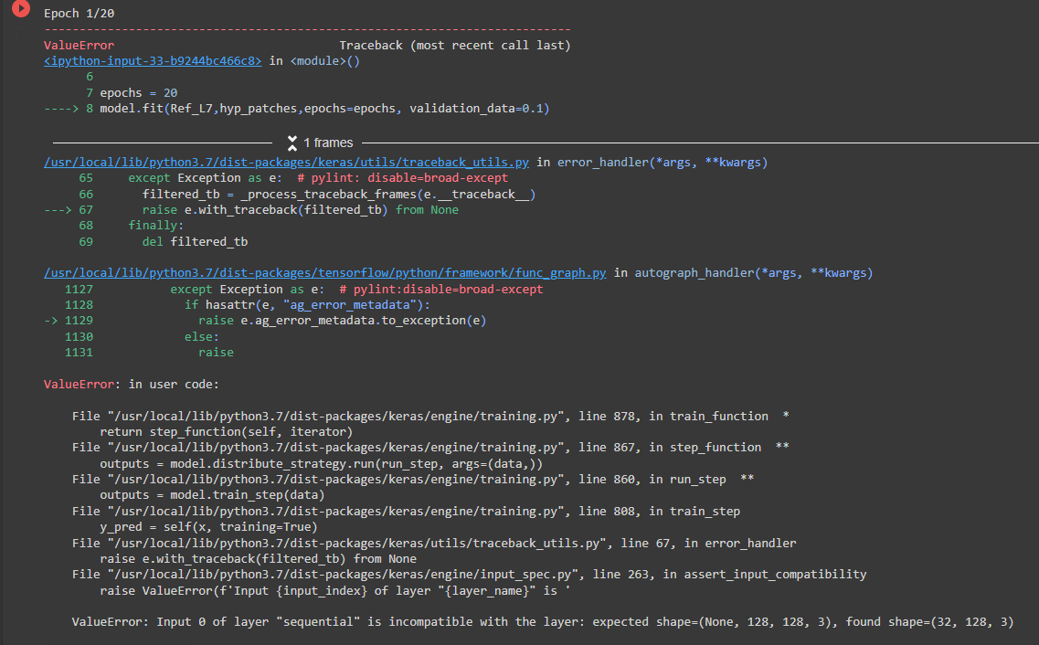 model.fit(Ref_L7,hyp_patches,epochs=epochs, validation_data=0.1)在添加通道3时更改IMAGE_SIZE。此外,打印您的形状的Ref_L7,hyp_patches,这将给你更多的信息,什么是错的。