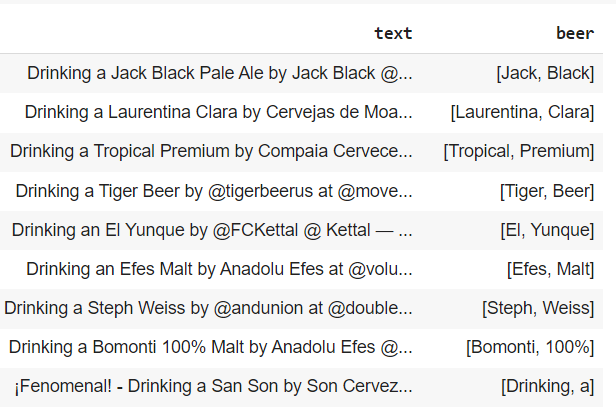 我有一个带有文本的数据框架,我想提取啤酒的名称,这个名字总是在“饮酒.”这个短语之后。我不能只提取第三和第四个单词,因为有时会有一些额外的词,如在最后一行。我想把啤酒的全名提取成一根绳子。有人做过类似的事吗?