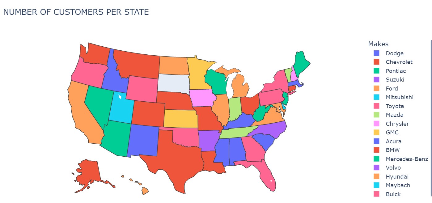 labels={'locations':'State','color':'Makes'},title='NUMBER OF CUSTOMERS PER STATE')