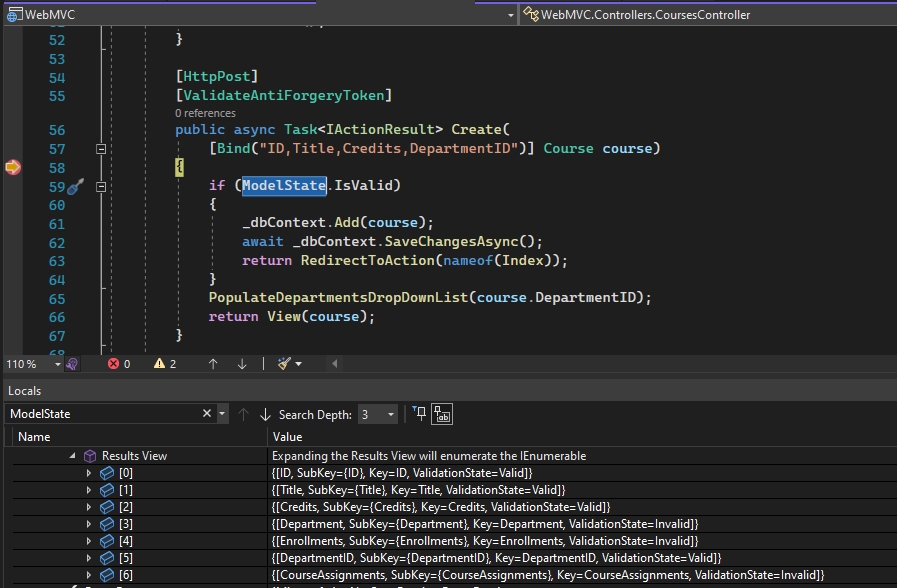 public ICollection<CourseAssignment>? CourseAssignments { get; set; }而且IMHO从不在控制器动作参数中使用bind。你总是会有问题的。它只在剃须刀页有用,但在非常罕见的情况下。在非常罕见的情况下使用Dto。当我必须从联接中创建大多数属性时,我通常只将Dto用于select。
