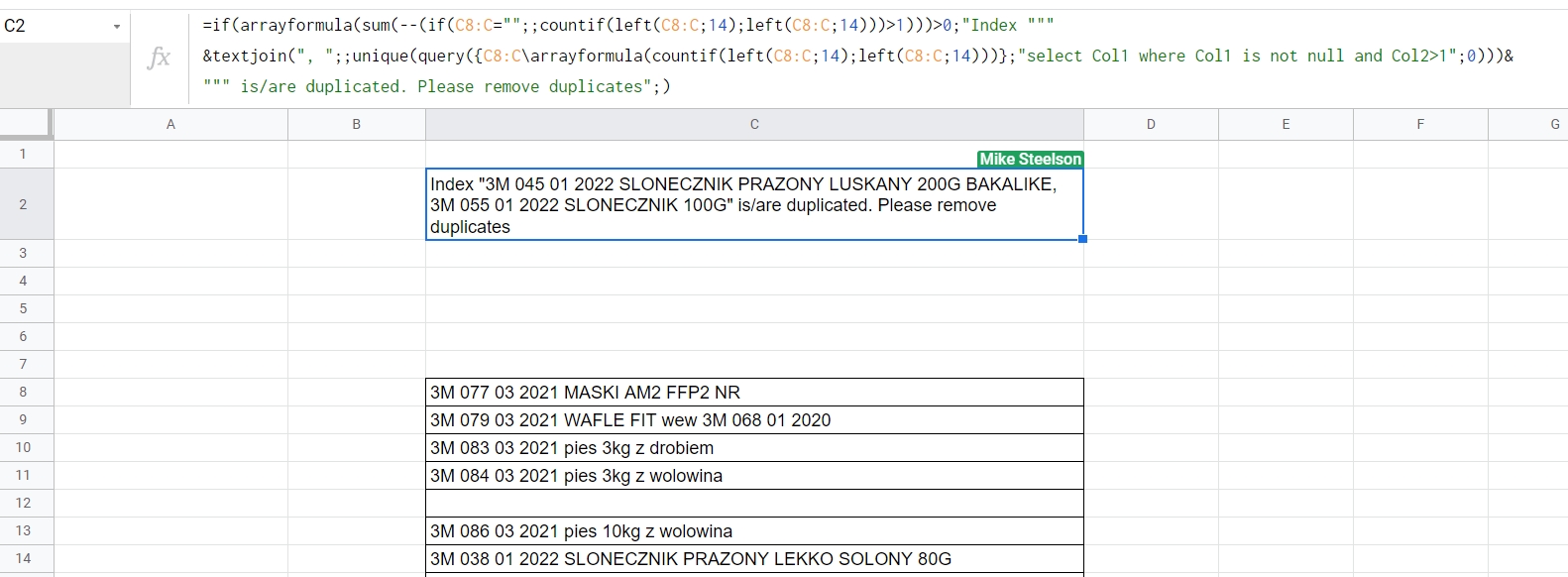 =if(arrayformula(sum(--(if(C8:C="";;countif(left(C8:C;14);left(C8:C;14)))>1)))>0;"Index 3M xxx xx xxxx is duplicated. Please remove duplicates";)还有细节..。