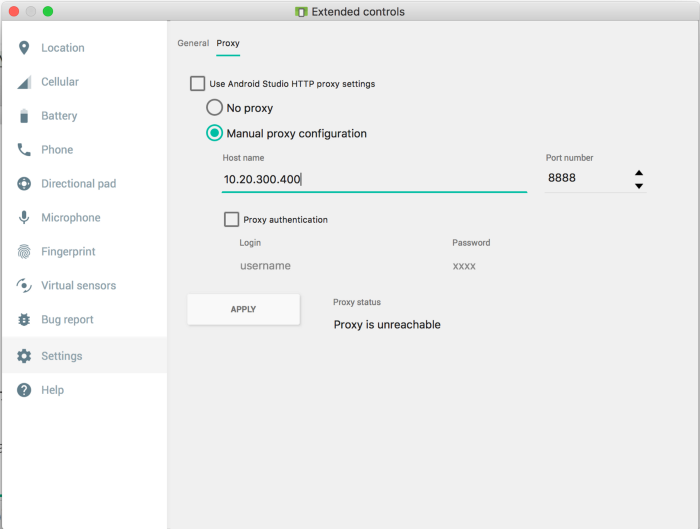 我需要通过Android在模拟器中手动配置代理。从官方Android文档中,可以在模拟器扩展控件的“设置”选项卡中进行此更改。问题是,在我看来,这个文档已经过时了,因为这个设置不再显示在Android模拟器扩展控件的“设置”选项卡中。