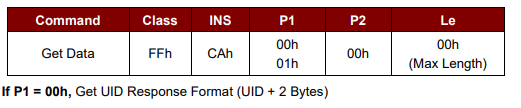 因此,我认为getuid = [0xFF, 0xCA, 0x00, 0x00, 0x00]正在向读者发送一个读取UID的命令,我在他们的手册中都找到了这个命令:
