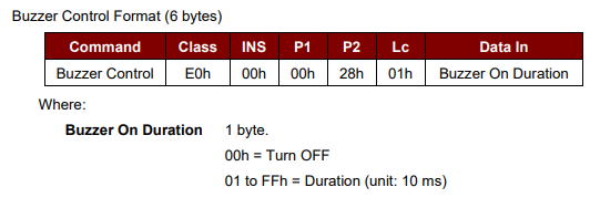 现在我想我可以用这个来控制蜂鸣器。在ACR1252U手册中,我发现了以下内容: