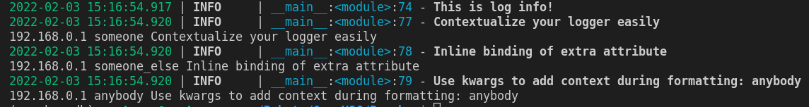 context_logger = logger.bind(ip="192.168.0.1", user="someone")