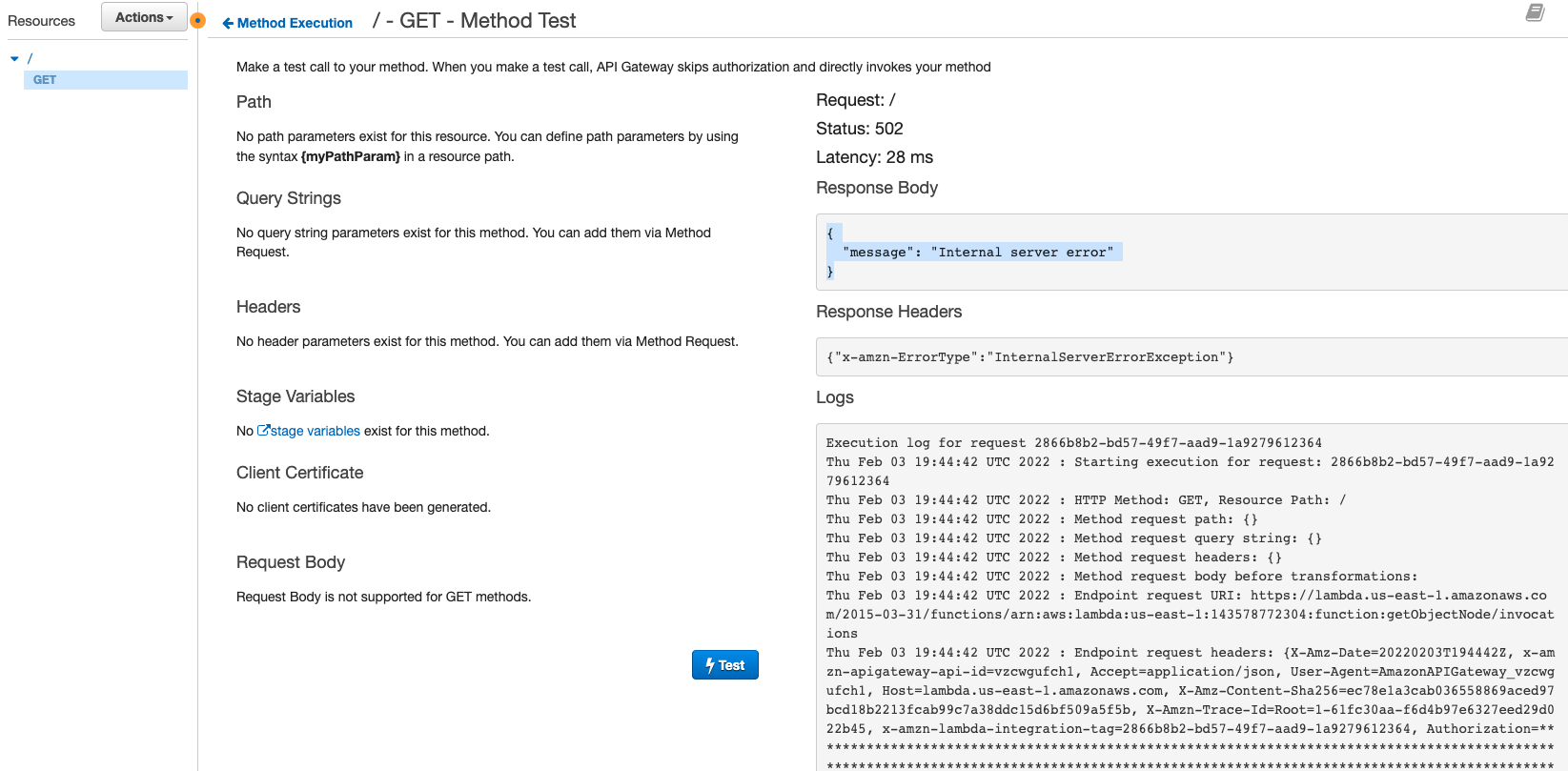 Thu Feb 03 19:44:42 UTC 2022 : Sending request to https://lambda.us-east-1.amazonaws.com/2015-03-31/functions/arn:aws:lambda:us-east-1:143578772304:function:getObjectNode/invocations