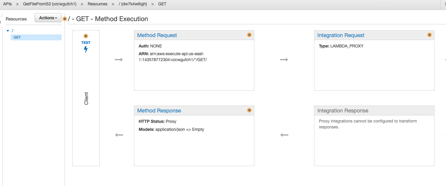 我正在测试AWS Lambda和API网关之间的功能。我的lambda函数使用一个节点,我已经定义了要从S3中提取的参数。这是我的羔羊