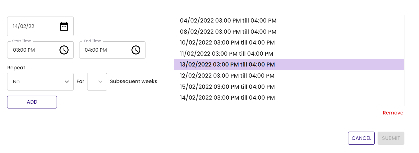 }, [toggleSort]);这里不介意我代码的其他部分。因为我也有一个功能,您可以批量添加日期。但同时,假设每次单击ADD时只添加一个日期,而repeatWeeks状态始终为0。